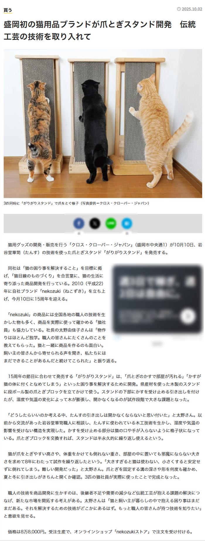 2025年10月2日 盛岡経済新聞Web記事で弊社の商品、木材を使用した縦型爪とぎ「がりがりスタンド」をご取材頂きました。記事をご覧ください。