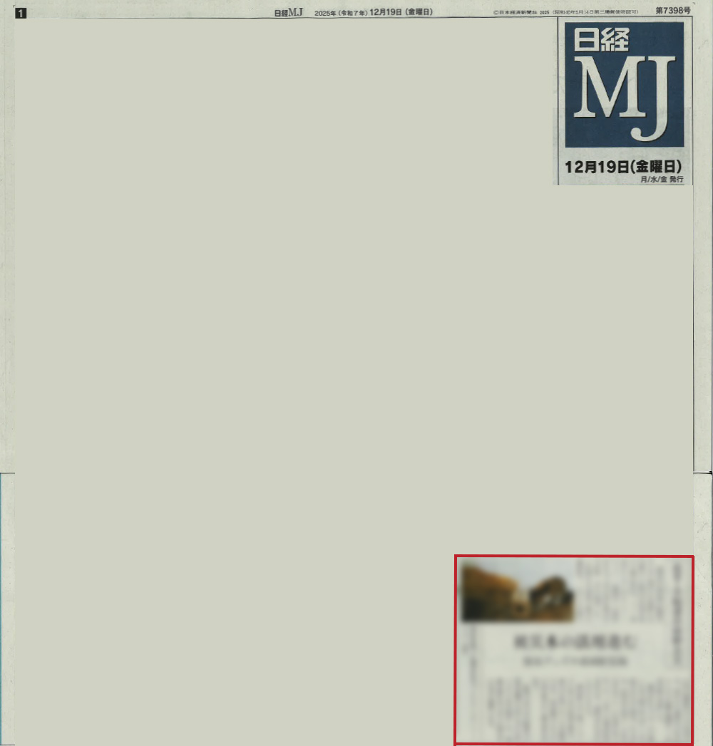 2025年12月19日 日経MJの紙面に、弊社の商品 岩手 大船渡山林火災の被災木を活用した知育おもちゃの「ちょいちょいBOX」と爪とぎの「がりがりマット」が掲載されました。