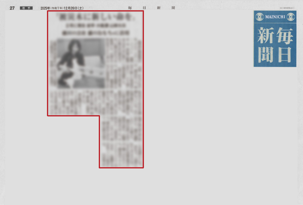 2025年12月20日 毎日新聞の紙面に、弊社の商品 岩手 大船渡山林火災の被災木を活用した知育おもちゃの「ちょいちょいBOX」と爪とぎの「がりがりマット」が掲載されました。